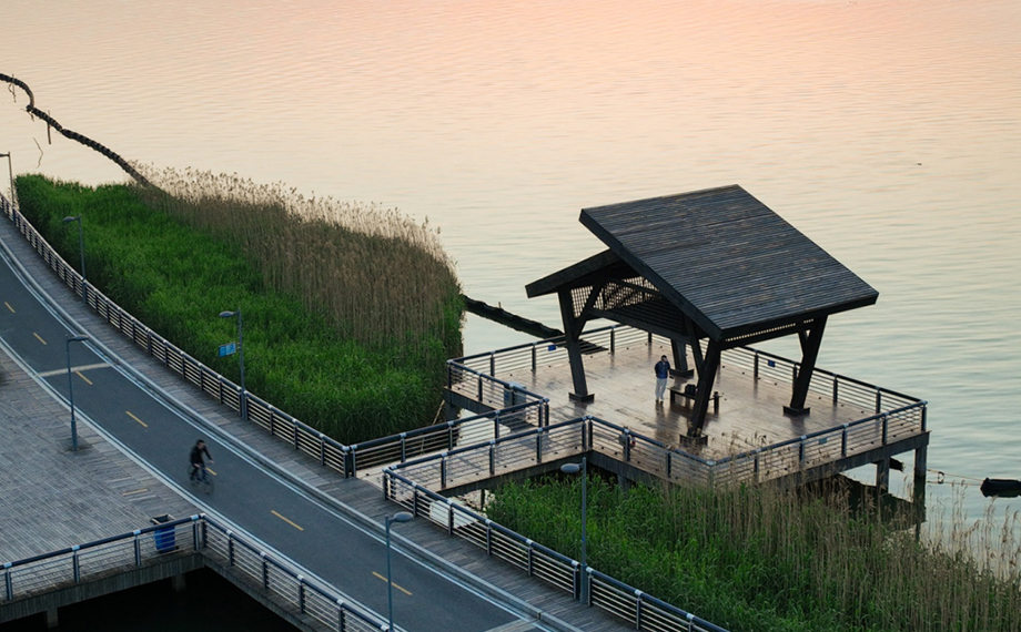在環(huán)湖自行車道上,也別忘了留意湖畔那些散落的親水木亭,它們靜靜地探向湖面,是絕佳的歇腳點。