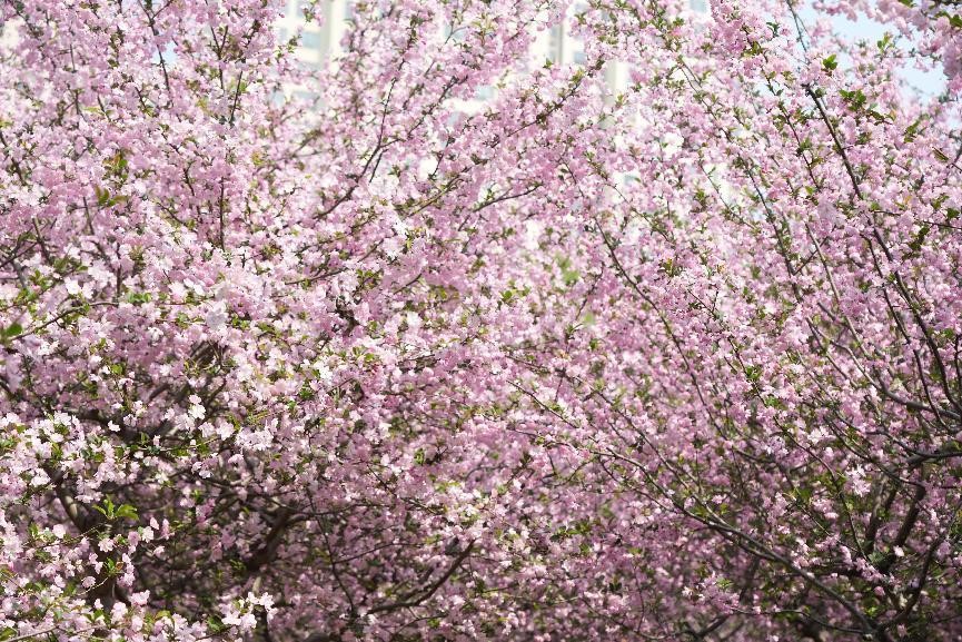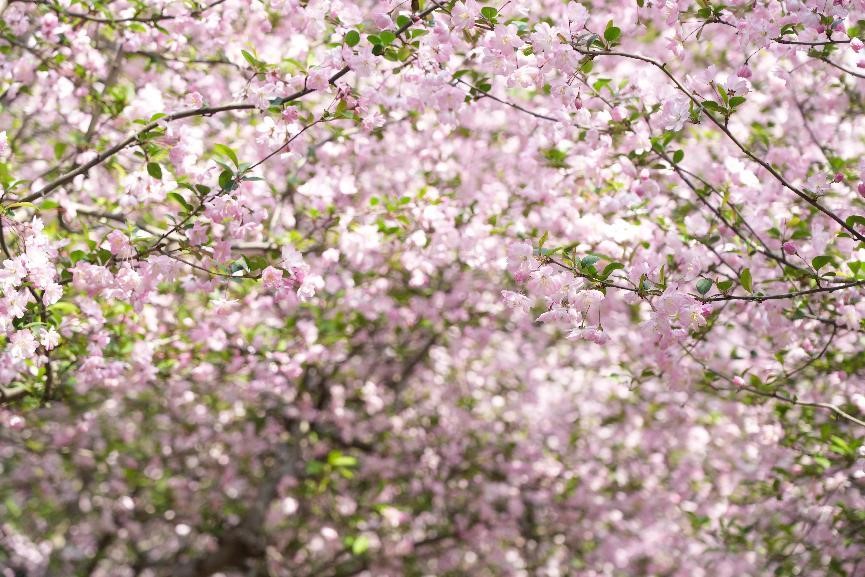 海棠花朵朵盛放時,枝條被花朵壓得微微低垂,形成了一片粉紅色的花海,宛如粉色的云霞,陽光透過花瓣灑下,光影斑駁,形成了一幅幅絕美的畫面。