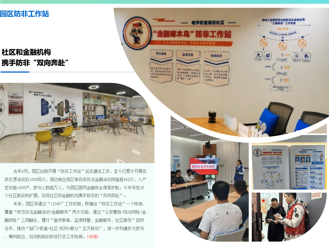 今年6月是第13個全國防范非法集資宣傳月,6月16日,蘇州工業(yè)園區(qū)舉行2025年防范非法金融活動集中宣傳日活動。現(xiàn)場,園區(qū)金融風(fēng)險防控系統(tǒng)正式上線,20個防非工作站新設(shè)和擴(kuò)圍,進(jìn)一步深化金融普法教育,推動“防非”宣傳教育工作落地生根、開花結(jié)果。防范非法金融活動宣傳教育工作是維護(hù)金融秩序穩(wěn)定、保障金融穩(wěn)健運(yùn)行的重要基石。作為區(qū)域金融高地,園區(qū)堅(jiān)持線上線下統(tǒng)籌推進(jìn),筑牢防范非法集資的社會防線。線上,動態(tài)監(jiān)測全域企業(yè),提高風(fēng)險識別科學(xué)性和準(zhǔn)確性,逐漸形成“底數(shù)清、責(zé)任明、發(fā)現(xiàn)早、處置快”一網(wǎng)縱觀全局的智能神經(jīng)中樞;線下,深化“防非工作站”內(nèi)涵,用好金融“鄰”距離系列活動資源,同時積極發(fā)動1.7萬... [詳細(xì)]
