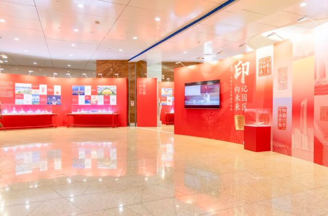 直播鏡頭跟隨導覽人的腳步,深入解讀了展覽的兩大構成部分。第一部分“印記園區”以94枚全新創作的印章,構建出“領航壁畫”“志合山?!薄皡秋L湖韻”“勇立潮頭”“盛世江南”五大篇章。這些作品不僅凝結了園區篆刻愛好者與專業工作者的創意巧思,更特別聚焦于園區的經濟發展、科技創新、自然景觀與產城融合圖景進行創作,讓古老的篆刻藝術與園區的現代化發展深度交融。