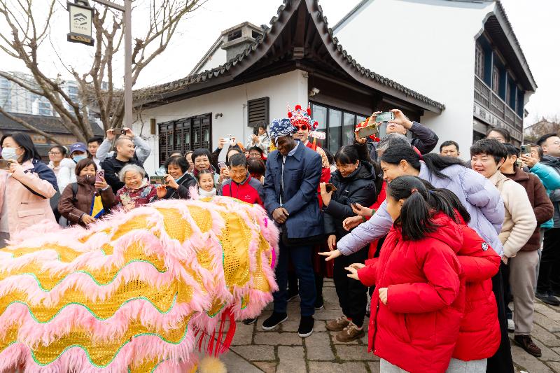 非遺演出更是精彩紛呈。木鳥象劇團帶來的非遺燈彩主題巡游將剪紙、年畫、風箏等元素幻化于華服與燈彩,交織成流動的光影劇場;大年初一,夏國璋龍獅團以梅花樁、一柱擎天等高樁表演獻上了精彩的開年好戲。