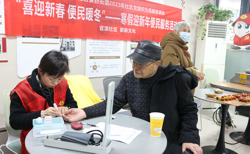 便民服務是活動中不可或缺的“重頭戲”。官瀆社區的市集上,免費測量血壓、血糖的攤位前人頭攢動,志愿者耐心地為居民測量指標,并講解冬季養生知識。幾步之遙的便民磨刀磨剪服務也深受歡迎,在志愿者嫻熟的手法下,銹鈍的刀具重現鋒芒,切實解決了居民生活中的小難題。