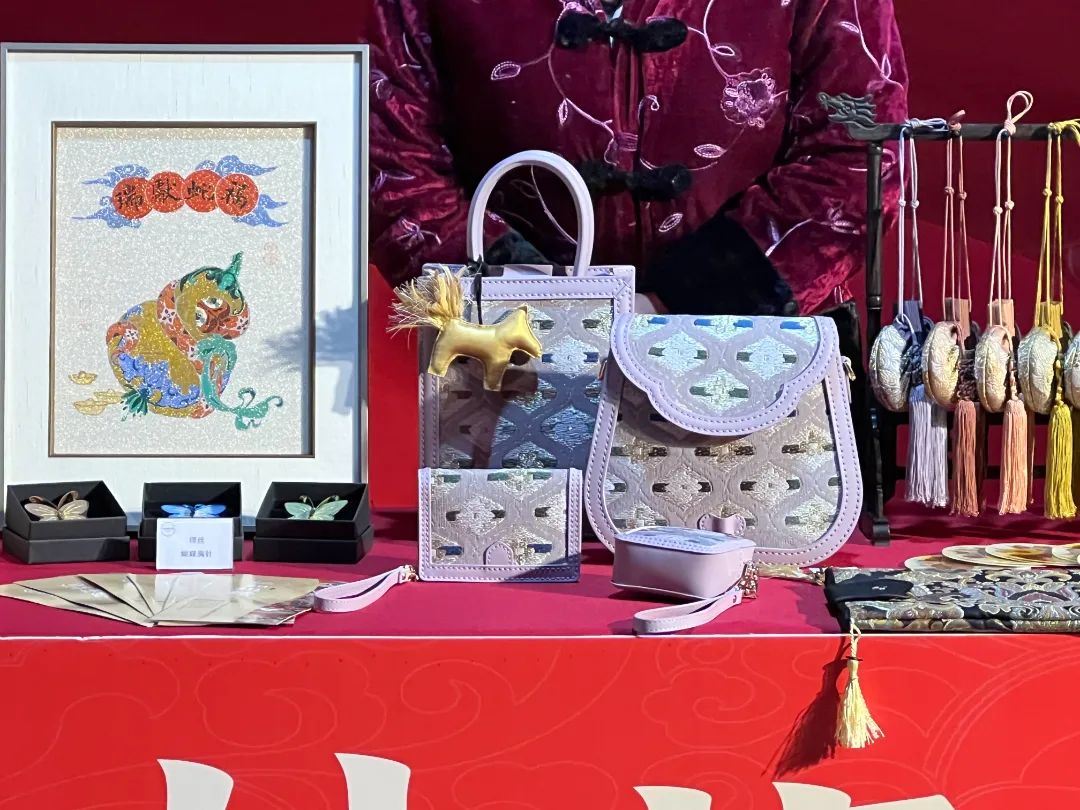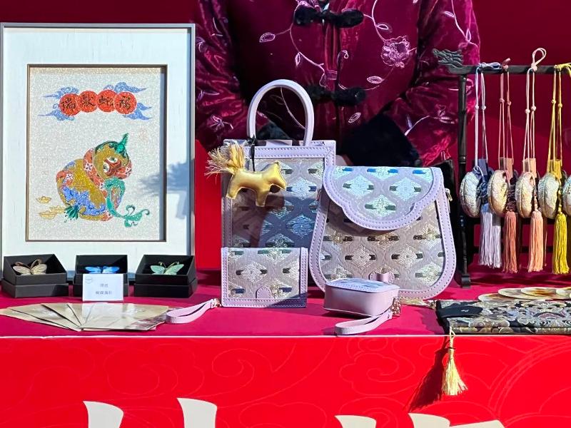 “這幅作品是福蛇獻(xiàn)瑞,采用緙繪結(jié)合的工藝,不僅寓意好,還是藝術(shù)跨界。這款蝴蝶胸針,采用緙絲面料、盤扣工藝,是兩項(xiàng)非遺技藝的結(jié)合體。這組紫色包具,設(shè)計(jì)時(shí)尚典雅,用的則是西陣織面料,也是非常珍貴的織造技藝!……”展位前,仁和織繡總經(jīng)理、高級(jí)工藝師謝晴容細(xì)數(shù)家珍,為市民游客介紹著產(chǎn)品特色和織造工藝。