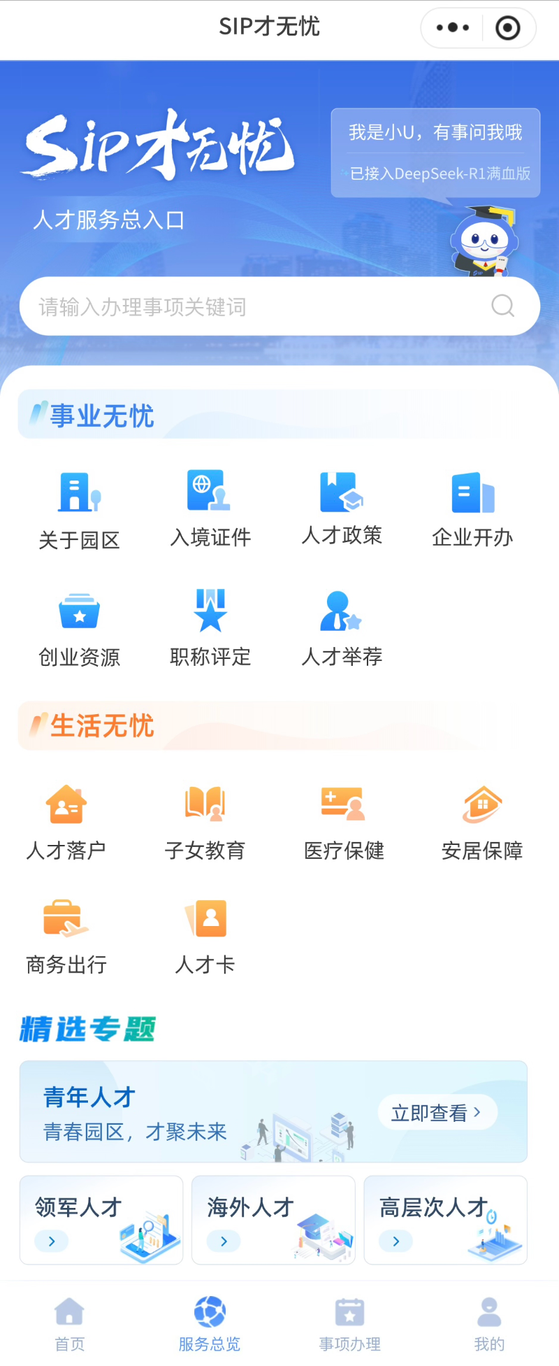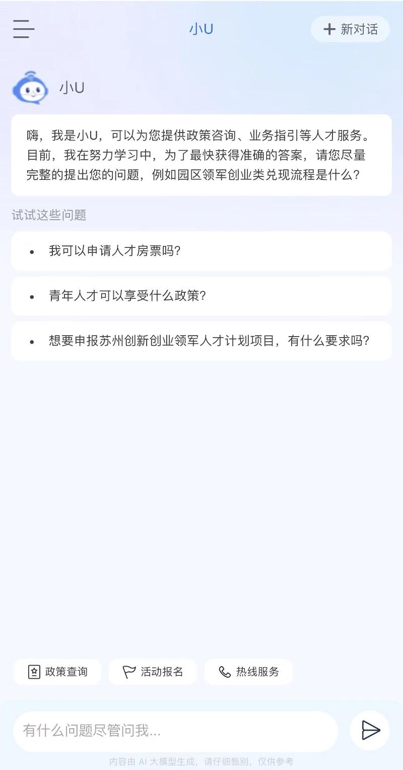 “SIP才無憂”深度聚焦提升人才的使用體驗,通過接入DeepSeek-R1“滿血版”,全新推出首個高智版AI助手“小U”,構建智能化人才服務體系,實現“政策秒配、服務無界”。