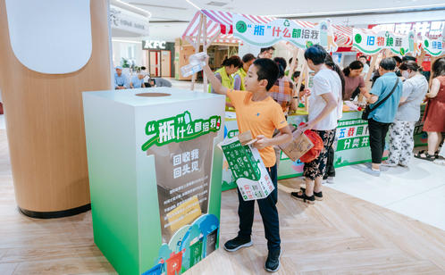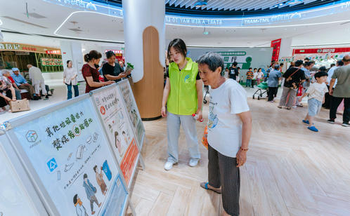 趣味游戲區(qū)的創(chuàng)意設(shè)計亮點頻出。居民們手持打卡地圖,穿梭于“垃分視力表”“分類大轉(zhuǎn)盤”“綠色補給站”等八大互動點位,通過趣味測試、知識問答、投擲游戲等方式邊玩邊學(xué)。“‘瓶’什么都給我”專區(qū)人氣爆棚,居民王阿姨用積攢的飲料瓶兌換了綠蘿,笑得合不攏嘴。“城投再生”“綠色補給站”和“舊物煥新”專區(qū)也深受居民青睞,居民們拎著紙箱、舊衣物排隊兌換環(huán)保袋、文具等實用物品,直觀感受到“垃圾是放錯位置的資源”。游戲化體驗不僅提升了垃圾分類知識的趣味性和互動性,更讓居民在輕松愉悅的氛圍中掌握分類技巧、提升環(huán)保意識。針對還不太熟悉如何正確分類的居民,志愿者則一對一講解垃圾分類知識,實現(xiàn)寓教于樂“零距離”。此外,志愿者們還同步宣傳倡導(dǎo)“光盤行動”“限塑”“減少使用一次性用品”等源頭減量、簡約適度的生活方式。