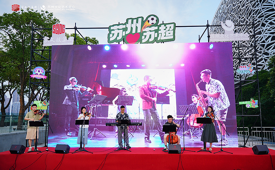 目光轉(zhuǎn)向現(xiàn)代傳媒廣場(chǎng)、蘇州文化藝術(shù)中心湖濱廣場(chǎng),球迷觀賽的“熱力值”同樣拉滿。作為夏夜市集頂流IP,傳媒之夜開啟“蘇超”模式,夜市云集40余家潮流“好市”,包括品牌餐飲、江南甄選、袞展文創(chuàng)等,滿足球迷看賽一切期待;足球魔方——籠式足球則讓市民體驗(yàn)競(jìng)技運(yùn)動(dòng)樂趣,在360°全圍擋的燈光籠中,快節(jié)奏攻防轉(zhuǎn)換不斷進(jìn)行,街頭足球的即興創(chuàng)造力盡顯。而在蘇州文化藝術(shù)中心湖濱廣場(chǎng),球賽的激情與多元文化的魅力交織,這里有豐富多樣的美食,熱愛生活、會(huì)玩有趣的生活藝術(shù)家,現(xiàn)場(chǎng)的演出更讓這個(gè)夏夜顯得與眾不同。