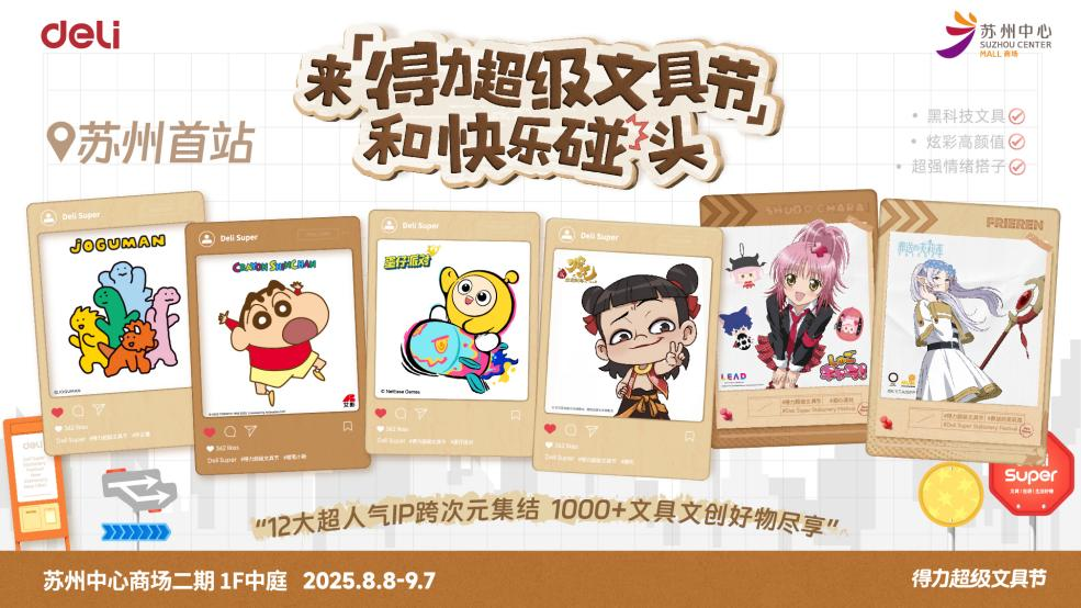 開學(xué)倒計時,裝備先到位。8月8日至9月7日,“得力超級文具節(jié)”限時登陸蘇州中心商場,為廣大學(xué)生黨、文具控和二次元愛好者帶來一場文創(chuàng)盛宴。作為蘇州首場得力大型IP文具快閃,活動現(xiàn)場集結(jié)12大人氣動漫及文創(chuàng)主題,1000+文具文創(chuàng)好物,推出實付滿額即贈限定文具福袋,吸引眾多學(xué)生與年輕消費者打卡,在挑選文具的過程中感受創(chuàng)意樂趣。