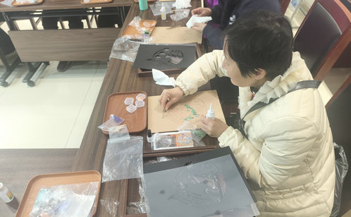社區(qū)活動(dòng)室內(nèi)一片歡聲笑語(yǔ),20余位居民在“紅色管家”志愿者的帶領(lǐng)下,開(kāi)啟了一場(chǎng)螺鈿藝術(shù)的體驗(yàn)之旅。老師首先向大家介紹了螺鈿工藝的歷史淵源。這項(xiàng)起源于商周時(shí)期的傳統(tǒng)鑲嵌藝術(shù)——以貝殼為原料,通過(guò)打磨、拼接形成精美紋樣——曾是宮廷裝飾的重要工藝。在老師的指導(dǎo)下,居民們手持工具,將一片片螺鈿細(xì)致地嵌入木質(zhì)底座上,有的拼出梅花傲雪,有的嵌成動(dòng)物圖案,有的組成“福”字紋樣。最后,大家將完成的作品裝入相框,封存住了這份親手創(chuàng)作的傳統(tǒng)之美。